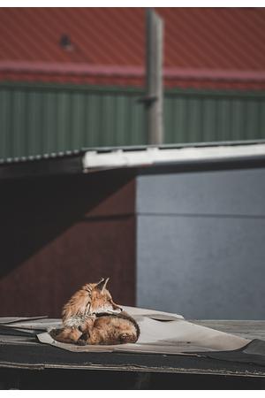 A beautiful red fox is sunbathing on a rooftop in the wild City of Whitehorse, Yukon.